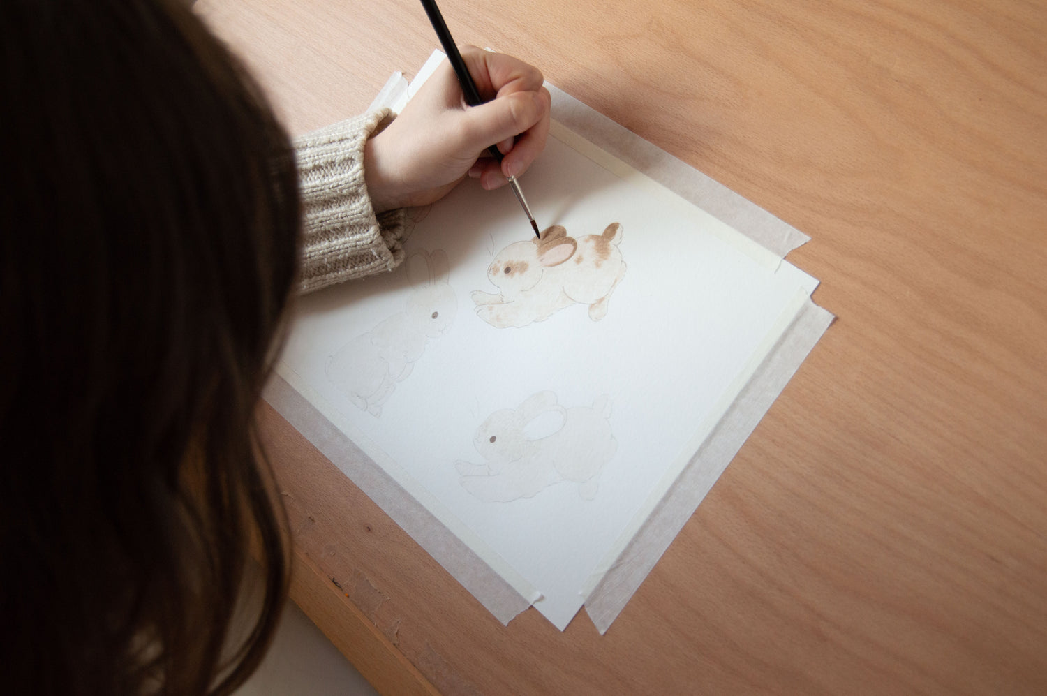 Our collection is brought to life by me, Rebecca, an illustrator based in Wales, UK. Each design starts as a small drawing from my sketchbook, which is then hand painted in watercolour to create soft, gentle illustrations for use across our range.